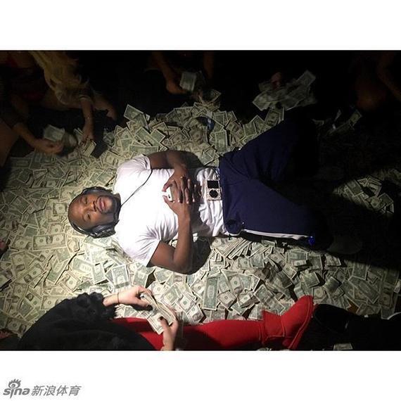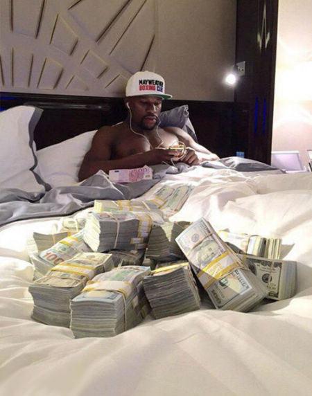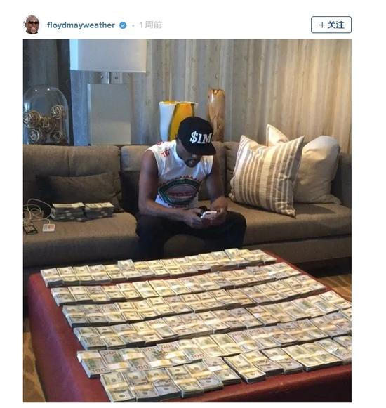 近日,前世界拳王梅威瑟在个人社交网站中再次炫富,照片中他坐在沙发上,面前放了满满一桌子的钞票,但它的主人只顾着玩手机完全不为所动。梅威瑟说道,“自己不需要动一根手指就能赚到几百万。”图为梅威瑟在桌上码钱。